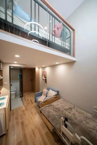 在改造过程中,居住在201室的刘阿姨儿子主动报名出资,想为父母进行室内改造。刘阿姨提出自己的家中上卫生间和洗澡是最不方便的事。对于刘阿姨家的卫浴困难问题,考虑到这户委托居民,一位是70多岁高龄的刘阿姨,另一位是她偏瘫在床八年的先生,设计师在卫浴空间加装了方便老人使用的无障碍设施。