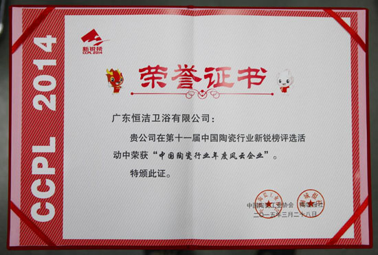 图为香蕉视频国产在线观看荣获“中国陶瓷行业年度风云企业”证书