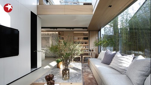 由于老宅的北墙和西墙都与邻居紧紧相邻,加之周围邻居都加盖了二楼,只有东墙可以采光,于是设计师在客厅东墙选用了一块长4.7米、宽2米,重达半蹲的超大玻璃窗,其充分引入了自然采光,使整个室内更加明亮、柔和。