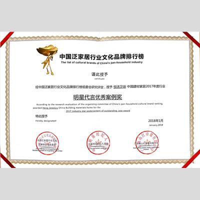 颁发单位:中国泛家居行业文化品牌排行榜组委会、中国明星经纪人协会、广东咉山红传媒有限公司