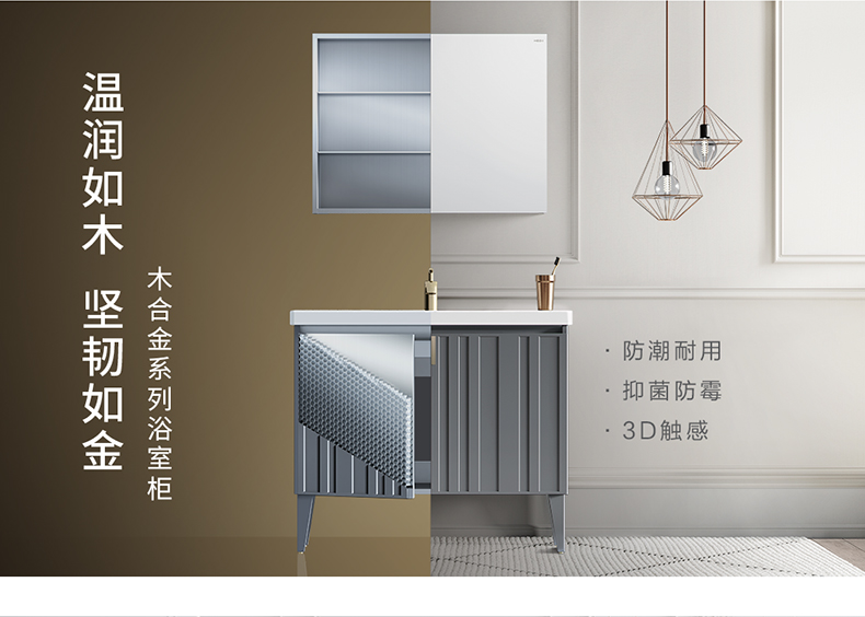 - 木合金柜体,防水防潮,随心安放;表面覆膜工艺,3D触感, 温润如木;