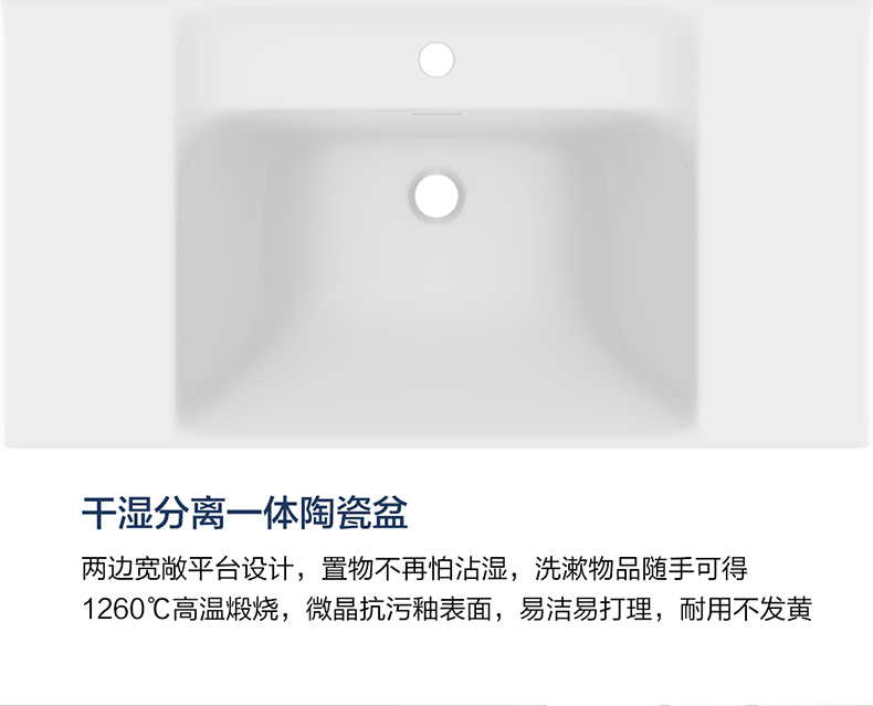 - 干湿分离一体盆,置物不再怕沾湿;两边宽敞平台设计,洗漱物品随手可得