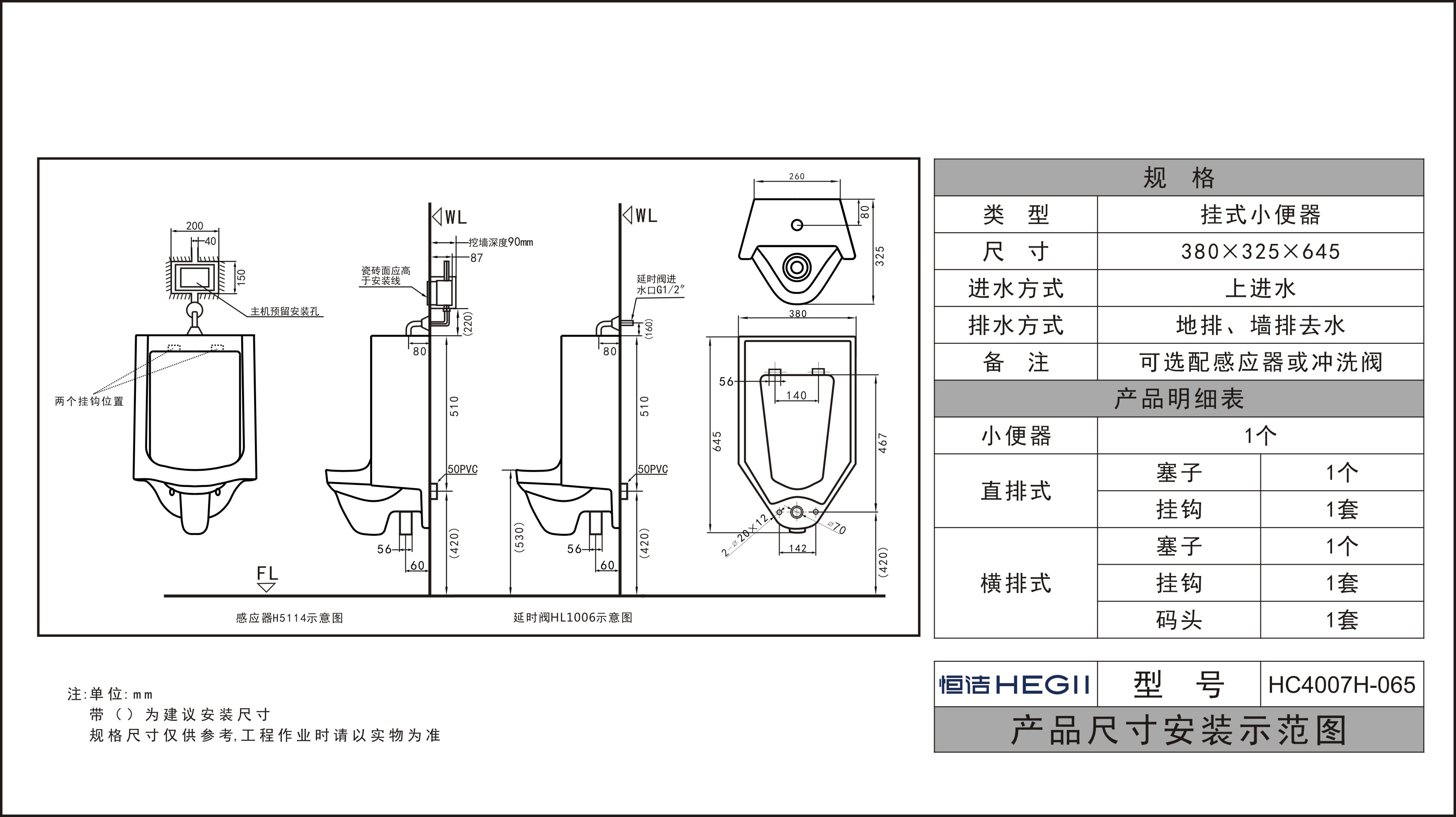 备注:可选配冲洗阀HMV21006\21002;感应器HMV11050AC/DC(需搭配上进水配件)